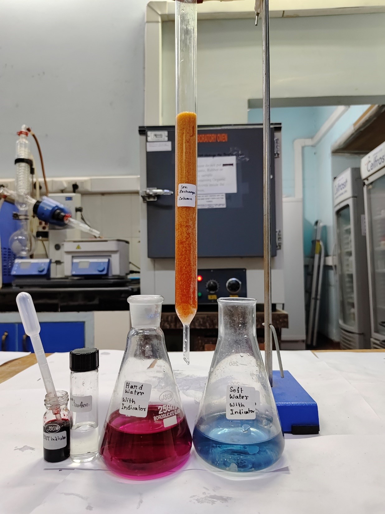 The color of soft water instantly changes into blue, while the hard tap water turns wine red when Eriochrome black T is added. The wine-red colored solution turns blue when titrated against the EDTA solution5.5. Sample Data and Analysis