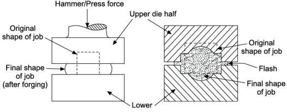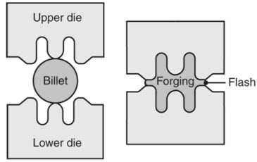 In closed die forging the workpiece is deformed under high pressure between two die halves, which have the impressions of the desired final shape. The heated metal (billet) is positioned in the lower die cavity and on it one or more blows are struck by the upper die. This hammering makes the metal (billet) to flow and fill the die cavity completely. Excess metal is squeezed out around the periphery of the cavity to form flash. On completion of forging, the flash is trimmed off with the help of a trimming die. The work material is given final desired shape in stages as it is deformed in several successive die sets. Thus, a high precision forged with close dimensional tolerances is produced. Closed die forging is shown in Figures 8, 9 &10. The shape of the die cavities cause the metal to flow in desired direction, thereby imparting desired fibre structure to the component. This process is also known as impression die forging.