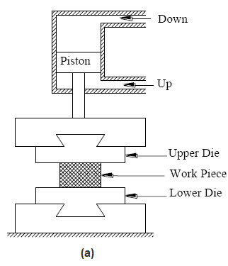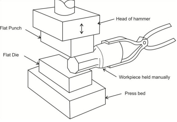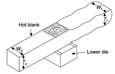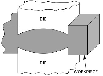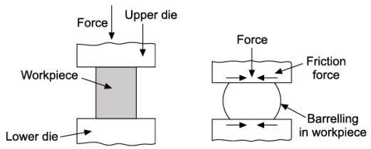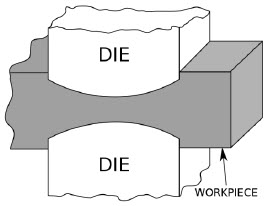 The simplest example of open die forging is the upsetting operation shown in Figure-12. In upsetting, a solid workpiece is placed between two flat dies and reduced in height (but increasing in size in lateral direction) by the application of compressive force. The die surfaces may be flat or having simple cavities to produce relatively simple forgings.