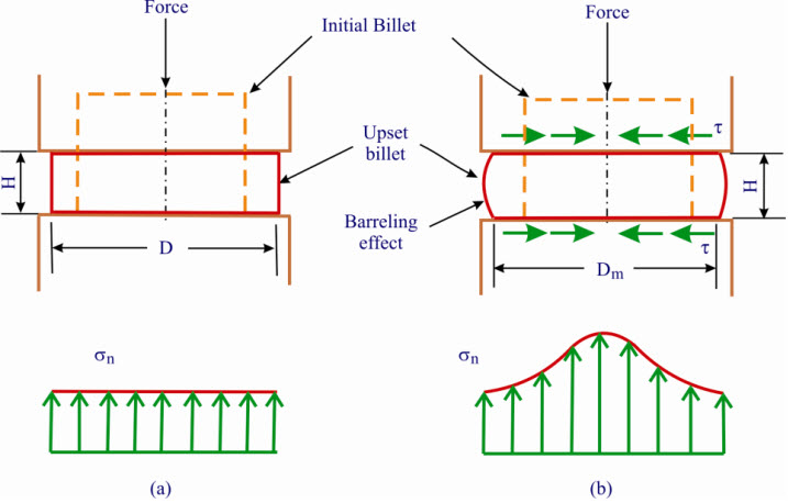 As the metal flows laterally between the advancing die surfaces, there is less deformation at the die interface because of the friction forces than at the mid-height plane resulting into the barreling of the sides of upset workpiece. Metal flows most easily towards the nearest free surface because that represents the lowest frictional path. Proper lubrication can help reduce the barreling effect. [Figures 12 & 13] (explained in next section).