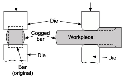 Cogging is an open die forging operation in which the thickness of a bar (or workpiece) is reduced by successive hammer blows at specific intervals (as shown in Figures-19, 20, 21, 22 & 23). Typical examples of cogging operation are shown in figures 21, 22, & 23. Since the contact area per stroke is small, thickness of workpieces are reduced in stages.