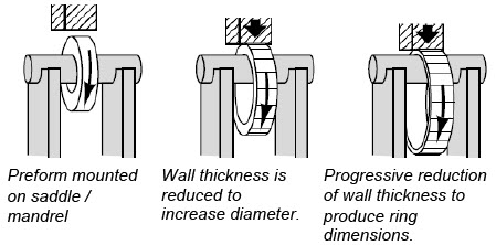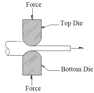 This process is used to reduce the thickness of round or flat bar with the corresponding increase in length. When the rolls are in open position, the heated bar stock is placed between the rolls. With the rotation of rolls through half a revolution, the bar is progressively squeezed and shaped. The bar is then inserted between the next set of smaller grooves and the process is repeated till the desired shape and size are achieved.