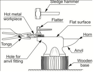 The tools used by a blacksmith include: anvil, swage block, hammers, tongs, swages fullers, and flatters. The shop where hand forging is carried out is called a smithy shop.