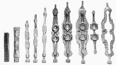 The hand forging process consists of forming the desired shape of a heated metal by applying repeated blows of a hand held hammer. A flat die or an anvil is used. The desired shape of the metal piece is maintained by the smith during the forging process as the desired length and cross-section are adjusted manually by positioning and turning the part on the flat surface of the anvil. While hammering, tongs holds the red hot metal and a well-rounded chisel shaped edge, called fuller, and is used to draw out the metal. Fuller is held on the metal by a helper while the smith strikes the metal with a hammer. The quality of the forging is wholly dependent on the skill of the smith.