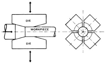 Rotary swaging is the application of forging process for shaping round bars, tubes in which the diameter of a rod or a tube is reduced. In rotary swaging process workpiece is held stationary and the dies rotate rapidly in a housing, the dies strike the workpiece at a rate as high as 10 - 20 strokes per second. The process is shown in figure 31. When compared to other methods of forging, production rate is high in rotary forging. The maximum diameter of work piece that can be swaged is limited to about 150 mm; work pieces as small as 0.5 mm diameter have been swaged. Swaging is a noisy operation.