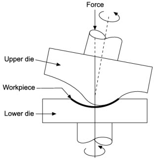 A typical rotary forging process (sometimes called orbital forging) makes use of two dies to deform only a small portion of the workpiece at a time, and the process continues till whole of the workpiece is deformed, one portion after the other. The axis of upper die is tilted to a small angle with respect to the lower die, figure 37. The inclined upper die rotates around the workpiece in such a way that only a small area of the die is in contact with workpiece at any time. The lower die, however, is kept in horizontal position and rotates at the same speed as the upper die.