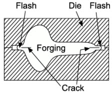 Cracking at the flash of closed die forging is another defect since crack may penetrate into the forging when flash is trimmed off. Either increase the flash thickness or relocate the flash to less critical region of the forging.