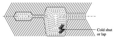 (v) Cold shut or fold is a discontinuity produced when two surfaces of the metal fold against each other without welding completely. The defect is caused due to sharp corners in the die cavity, excessive chilling or high friction.
