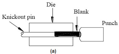 (i) Keep the blank in the die as shown in figure 43(a) and position the kick out pin depending on the length of rivet required. Punch should have the negative shape of the rivet head as shown.