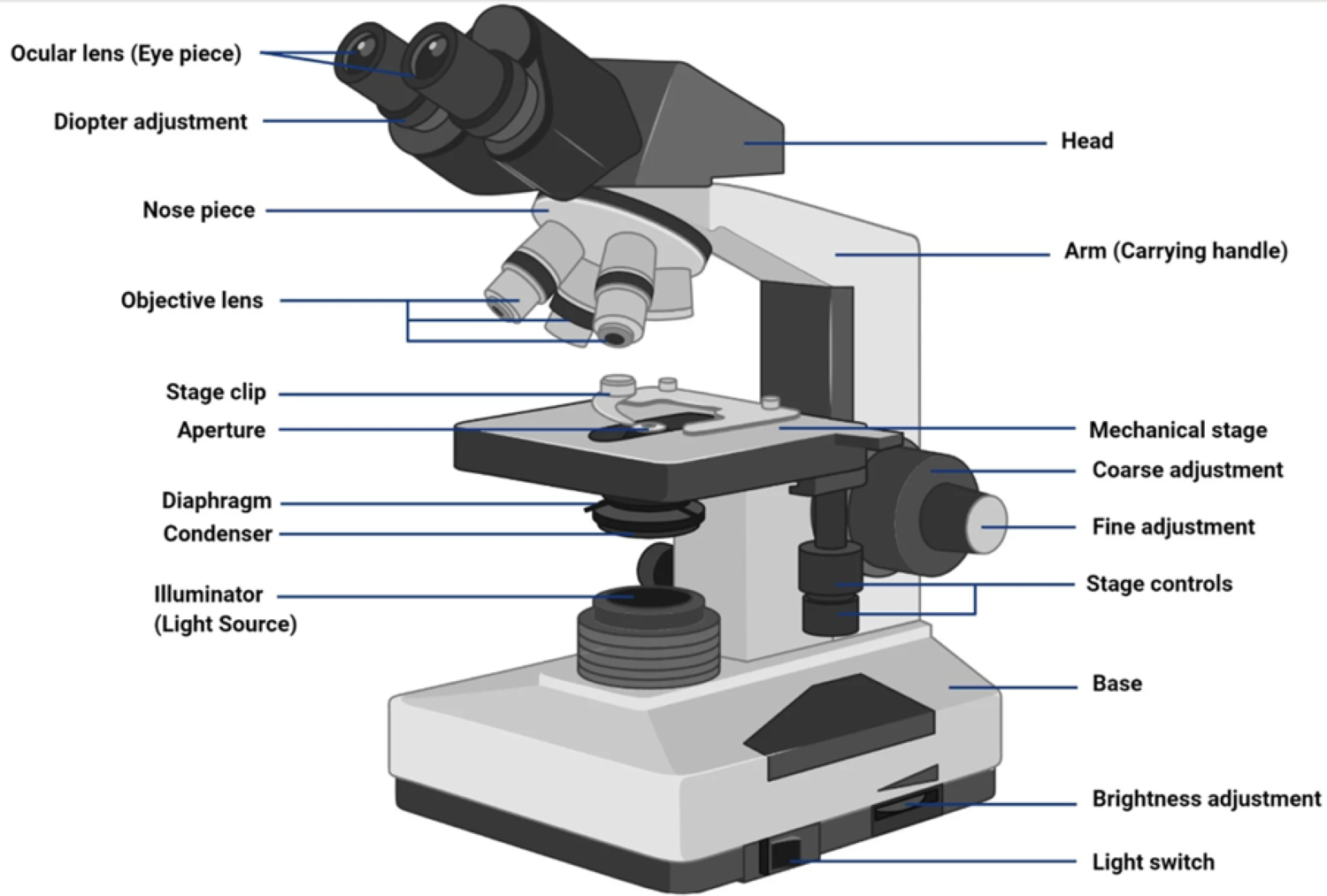 • Bright field Illuminator : The light source that produces white light for the specimen, usually a halogen lamp or an LED. Light from the illuminator passes directly through the sample and into the objective lens. Features that absorb or scatter light appear darker than the bright background.