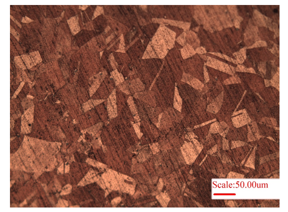 The microstructure of copper (Cu) is presented in Fig.1. As pure copper is very soft, the removal of polishing scratches is not easy, and the same can be observed in the microstructure (Fig. 1). The brighter and darker regions arise because of different orientation of grains. Herein, electropolishing may be helpful in removing the scratches for better visualization of microstructure of softer materials. Consequently, brass (alloy of Cu and Zn) is harder and its microstructure is presented in Figure 2. The bright region is dendrites (alpha-phase of Zn), whereas the surrounding dark region is beta-phase (𝛽′, of Cu), Fig. 2. Further, Widmanstätten microstructure of brass is presented in Fig. 3, wherein long lath of alpha-phase (bright regions) is present within surrounding beta-matrix (𝛽′, dark-region).