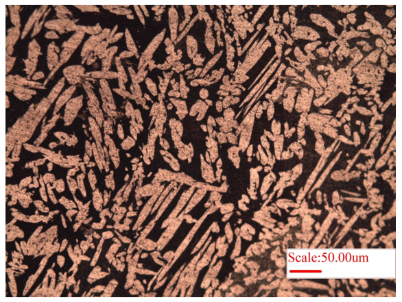 Figure 3: Microstructure of brass showing Widmanstätten microstructure of brass exhibiting elongated alpha-lath structure (Zn) embedded within beta (𝛽′, Cu) matrix.