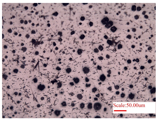 Figure 4: Microstructure showing the distribution of carbon (graphite) nodules in the nodular cast iron.