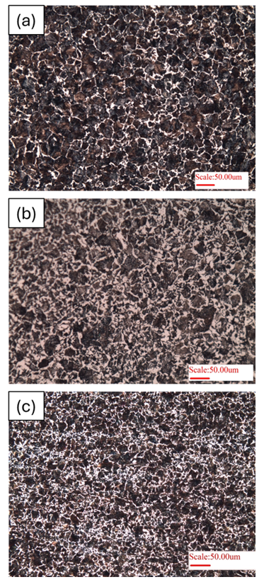 Figure 5: Microstructure of 0.45%C steel (hypoeutectoid steel) of: a) as-received sample, b) Annealed heat-treatment, and c) normalizing heat treatment.
