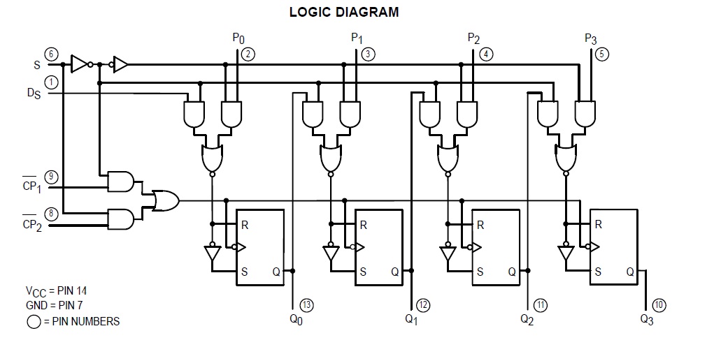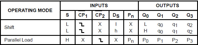 S The SN54/74LS95B is a 4-Bit Shift Register with serial and parallel synchronous operating modes. It has a Serial (DS) and four Parallel (P0–P3) Data inputs and four Parallel Data outputs (Q0–Q3). The serial or parallel mode of operation is controlled by a Mode Control input (S) and two Clock Inputs (CP1) and (CP2).When the Mode Control input (S) is HIGH, CP2 is enabled. A HIGH to LOW transition on enabled CP2 directly loads parallel data from the P0–P3 inputs to the Q0–Q3 outputs. When the Mode Control input (S) is LOW, CP1 is enabled. A HIGH to LOW transition on enabled CP1 transfers the data from Serial input (DS) to Q0 and shifts the data in Q0 to Q1, Q1 to Q2, and Q2 to Q3 respectively (right-shift). For normal operation, S should only change states when both Clock inputs are LOW. However, changing S from LOW to HIGH while CP2 is HIGH, or changing S from HIGH to LOW while CP1 is HIGH and CP2 is LOW will not cause any changes on the register outputs.