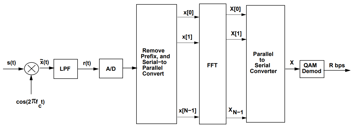 The OFDM receiver schematic is as shown below. Details of each block have been explained in the forthcoming sections.