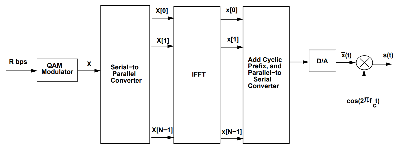 The OFDM transmitter schematic is as shown below. Details of each block have been explained in the forthcoming sections.