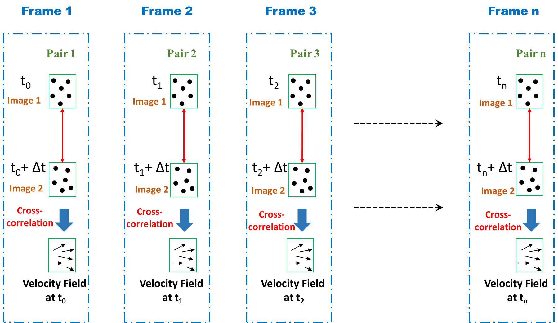 The process is repeated across many frames (Frame 1 to Frame n), producing time-resolved velocity fields.