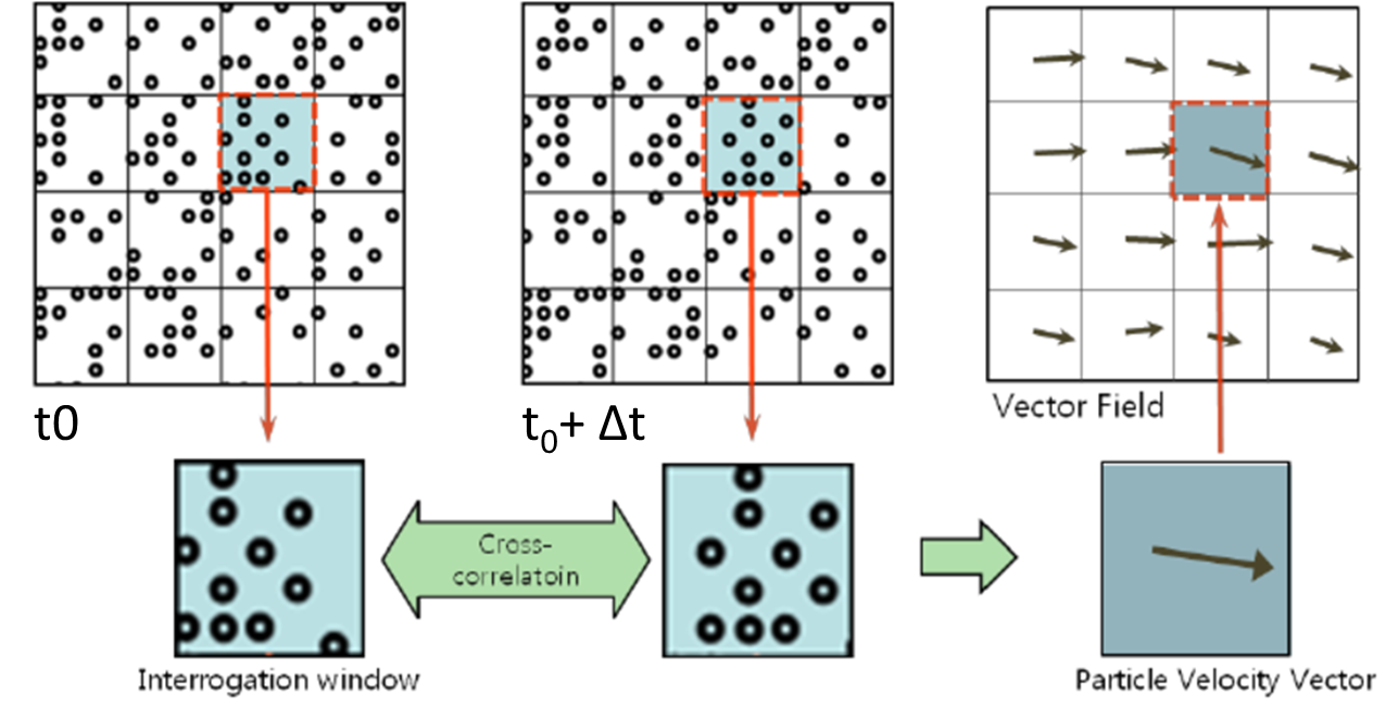 Each pair of interrogation windows (from the two images in a pair) is compared to track the displacement of particles using cross-correlation algorithms.