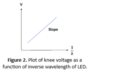 The knee voltage V can be measured for LED's with different values of λ (wavelength of emmited light). Now from eq. (4), we see that the slopes of a graph of V vs 1/λ is hc/e (Figure 2).