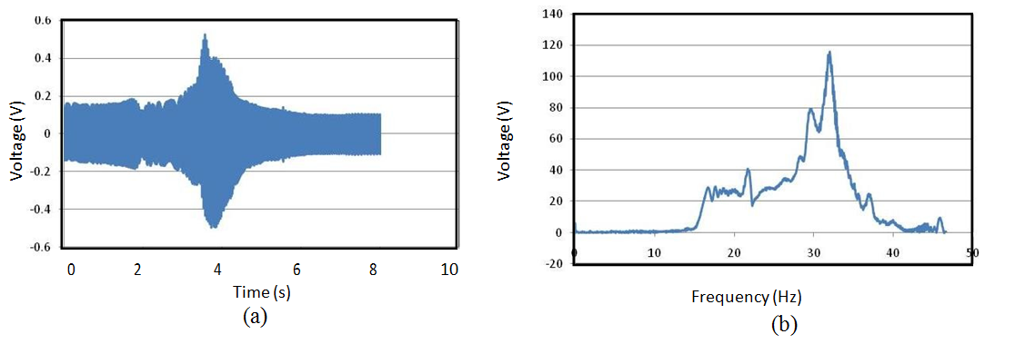From the frequency plot, the user can identify the natural frequency of the beam as the frequency corresponding to which peak voltage response is observed (here around 32 Hz). The damping ratio can be calculated using the half power band method (Paz, 2004) as