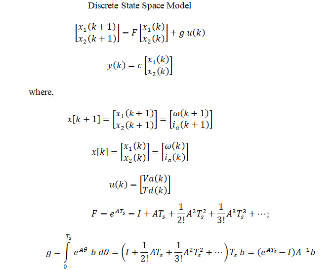 Motor torque constant : Km= Armature Inductance : L= Armature Resistance : R= Moment of inertia : J= Coefficient of Friction : Kf= Back emf constant : Kb= Sampling Time (sec) : Ts=