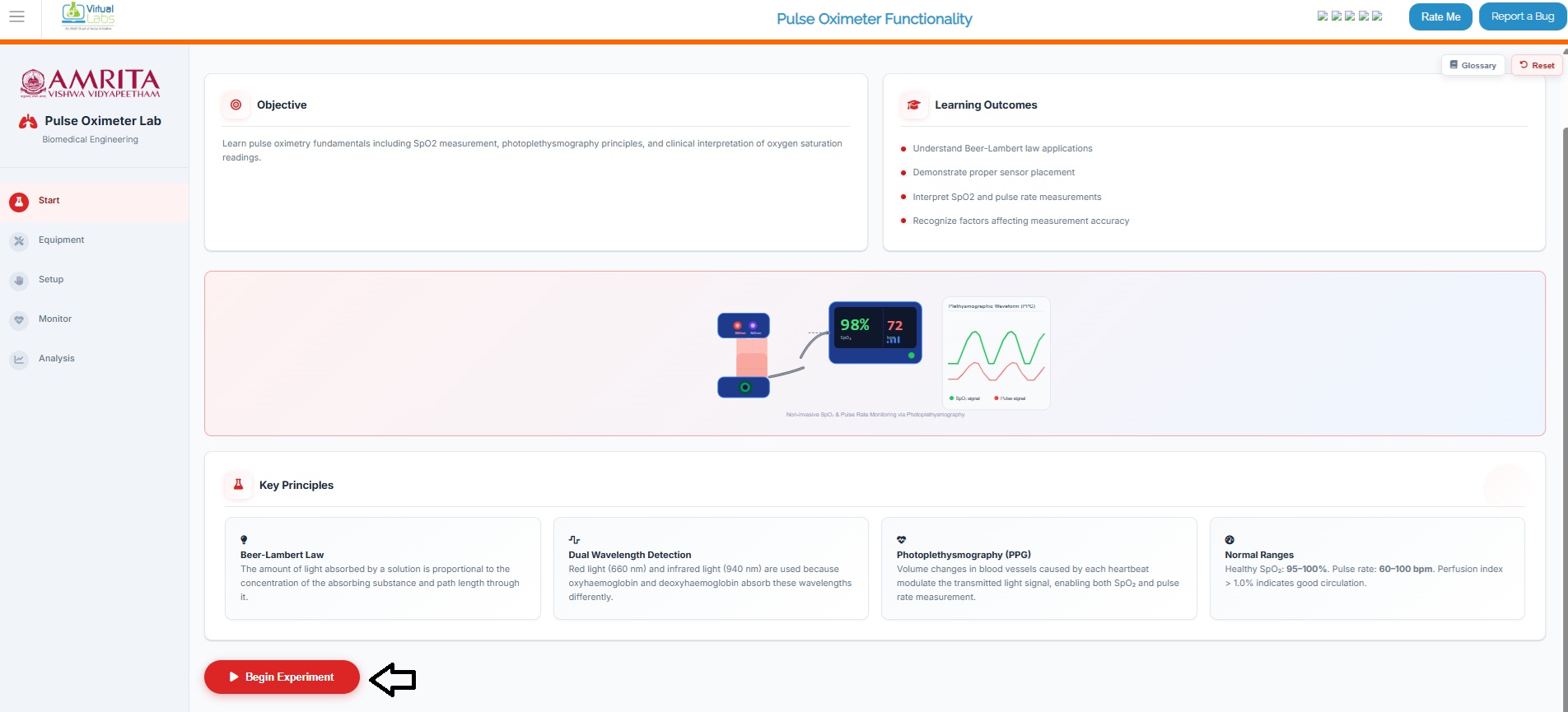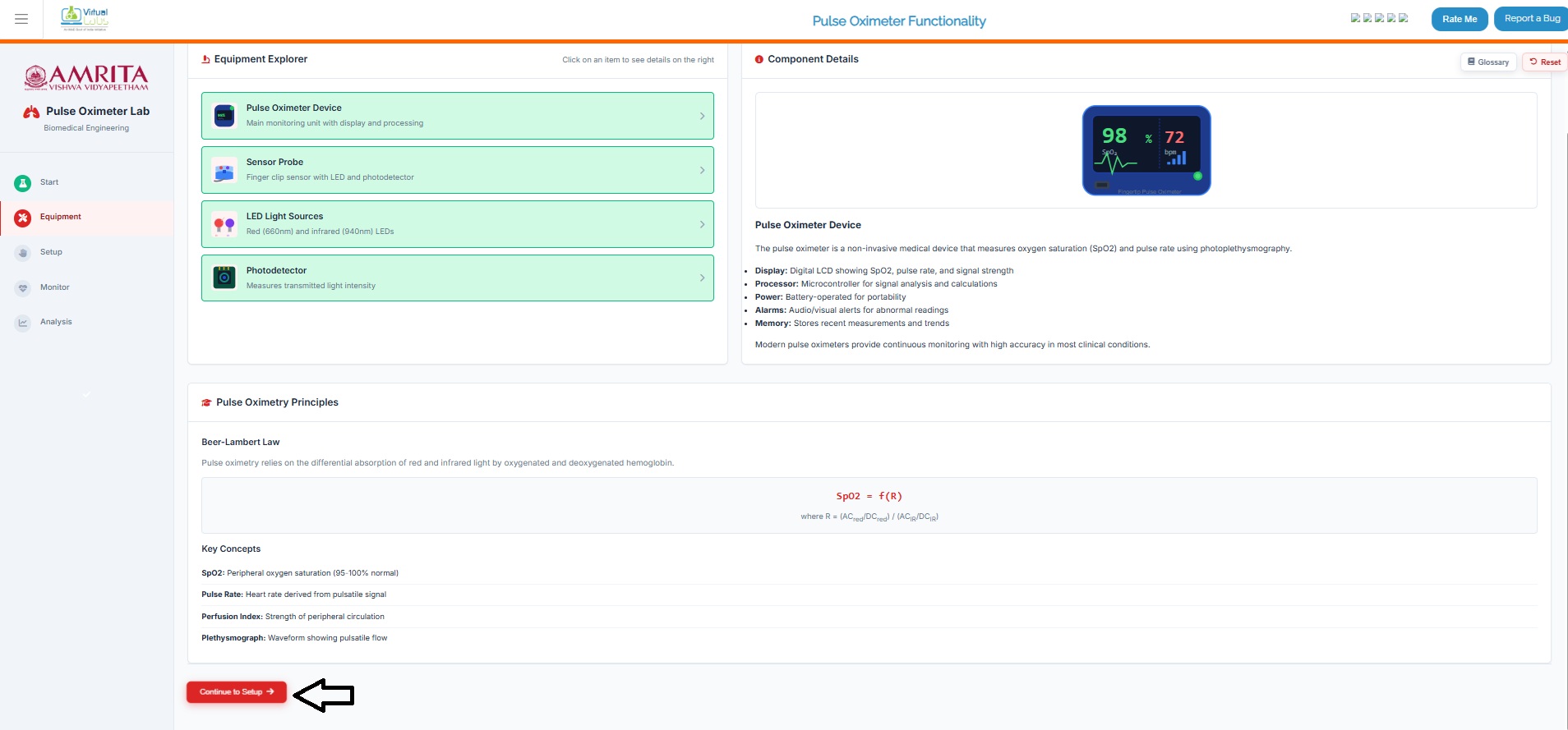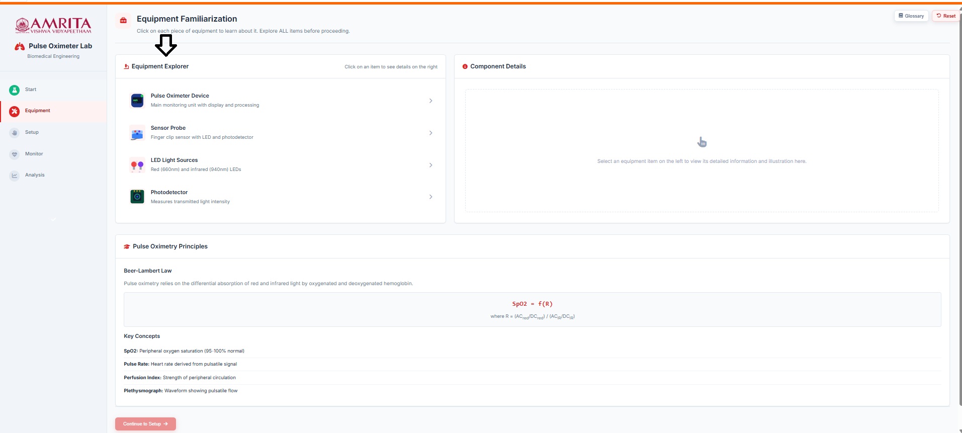 - Users can view and perform Equipment Familiarization. Click on each equipment component (Pulse oximeter device, sensor probe. LED light source and photodetector) to get a brief explanation of each component.