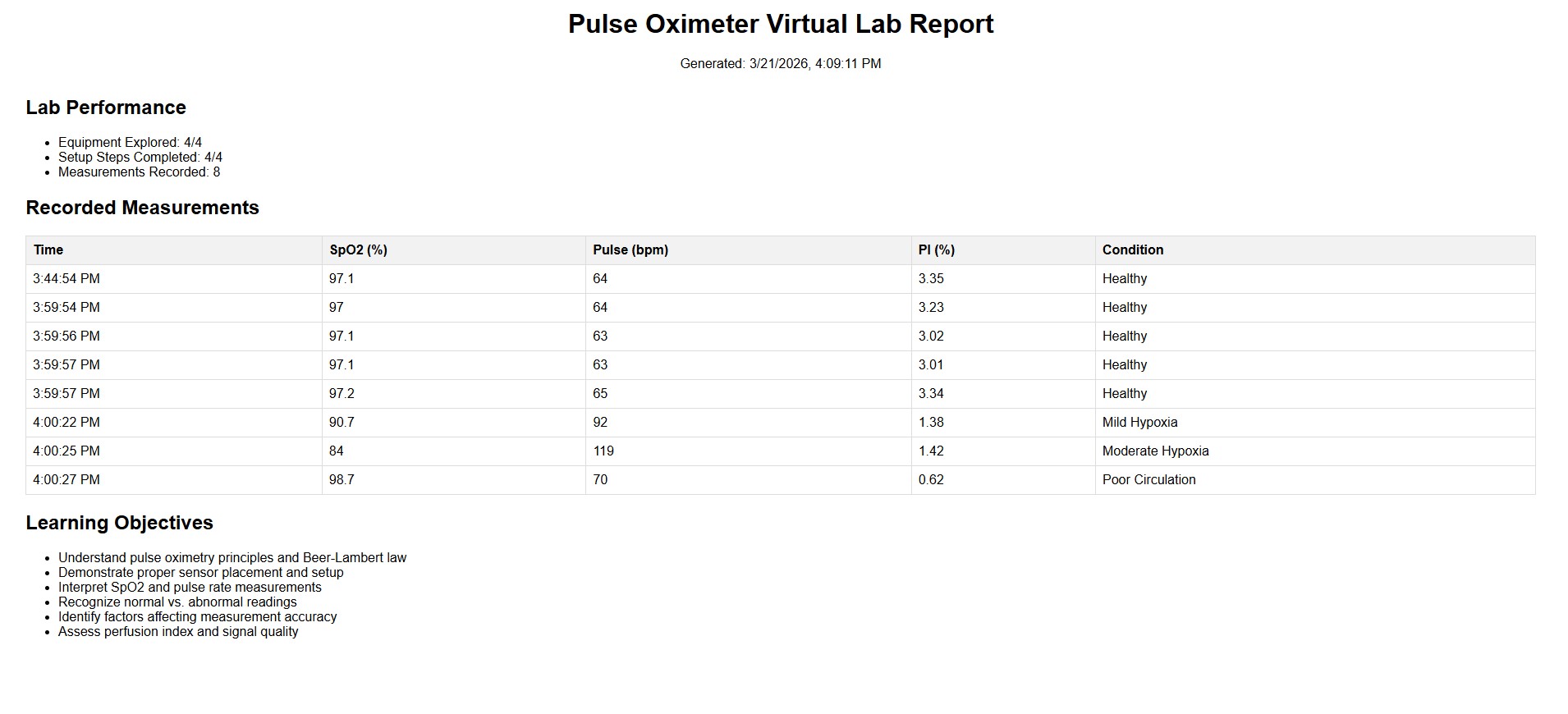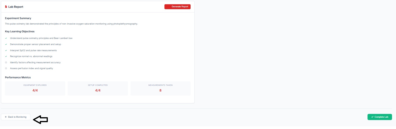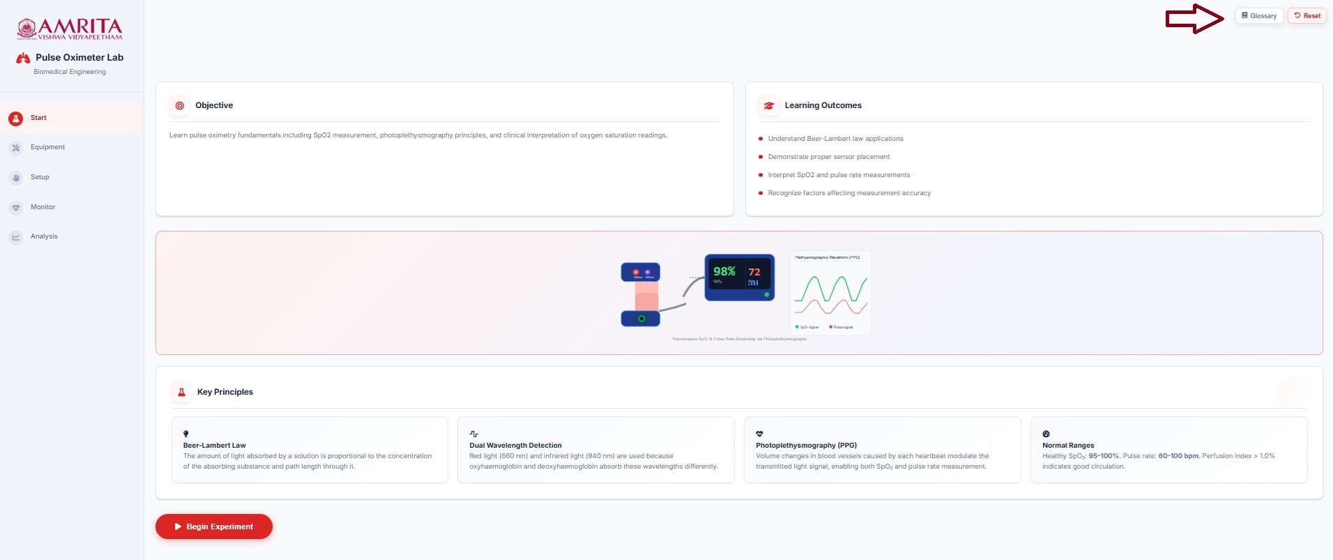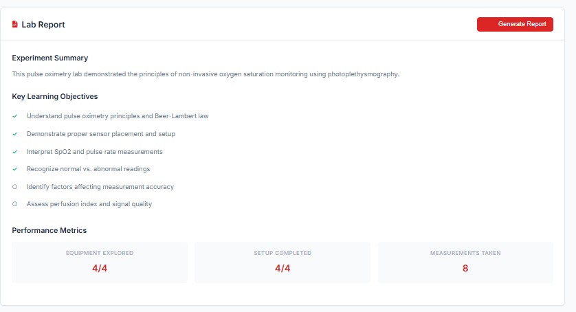 - Users can view and perform Equipment Familiarization. Click on each equipment component (Pulse oximeter device, sensor probe. LED light source and photodetector) to get a brief explanation of each component.