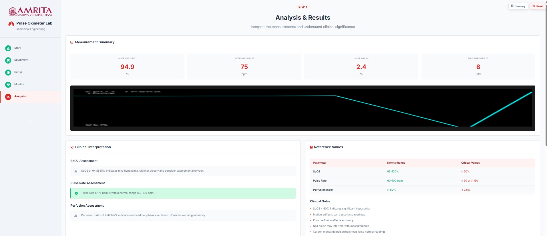 - The analysis page shows the summary of the measurements taken during the recording stage. The average SpO₂, average pulse rate, perfusion index (PI), and the total number of measurements recorded are displayed. Additionally, a clinical interpretation of these values is provided.