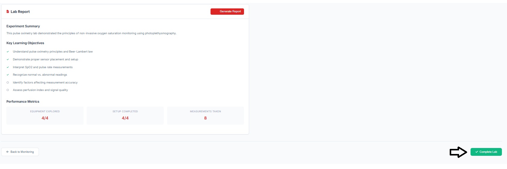 - The performance matrix is also displayed in the simulator window. The user can click on the “Complete Lab” tab to choose whether to download the results; this option provides an output similar to the “Generate Report” feature described in Steps 12.