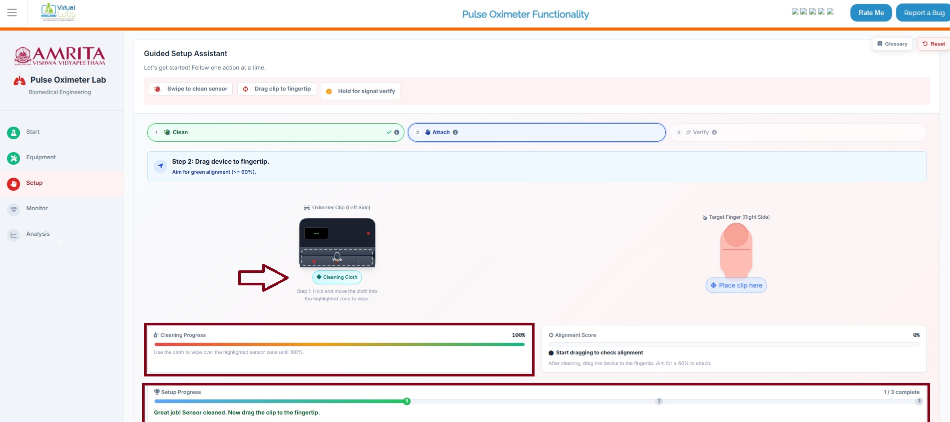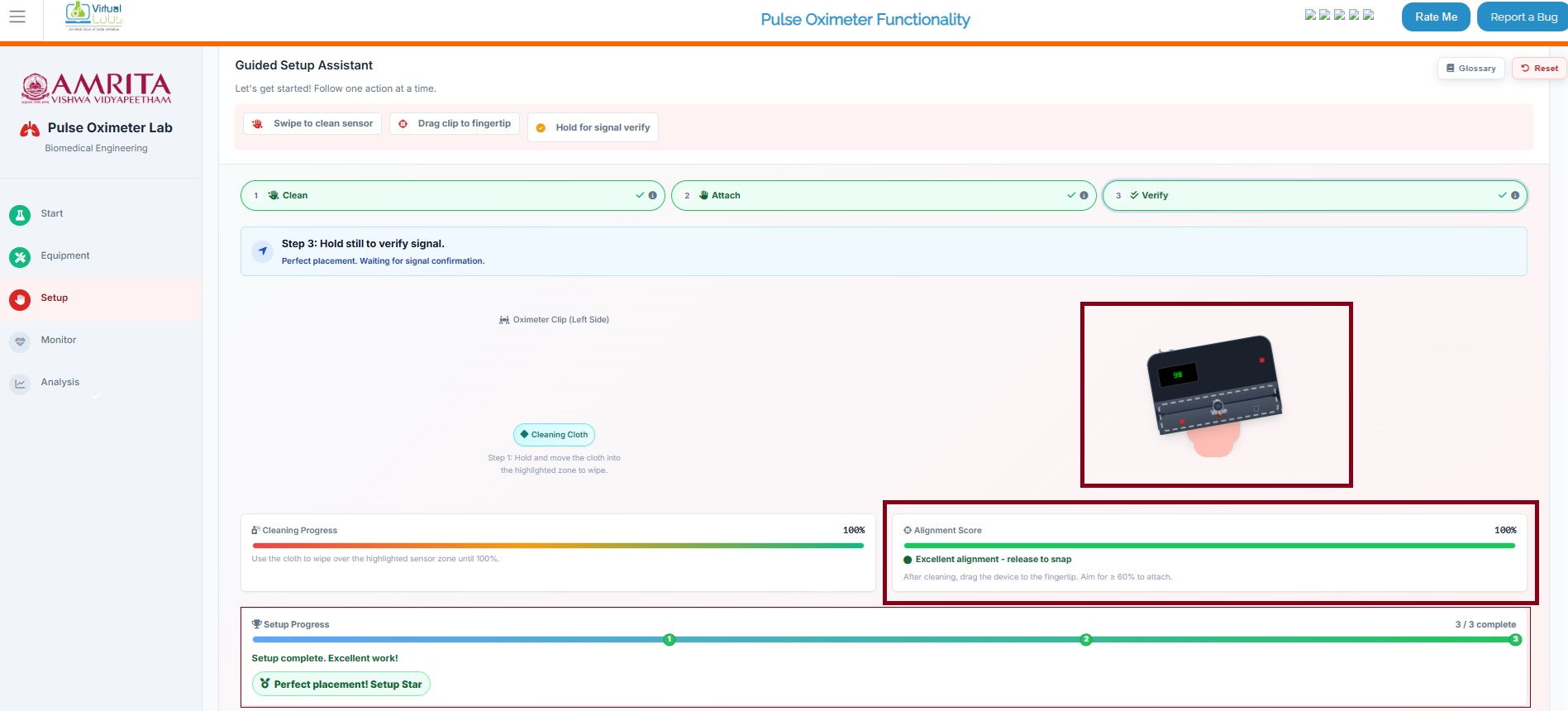 - The next step is to keep the pulse oximeter on the fingertip. For that drag the pulse oximeter to the fingertip. The alignment score and the Setup Progress will be displayed in the simulator.