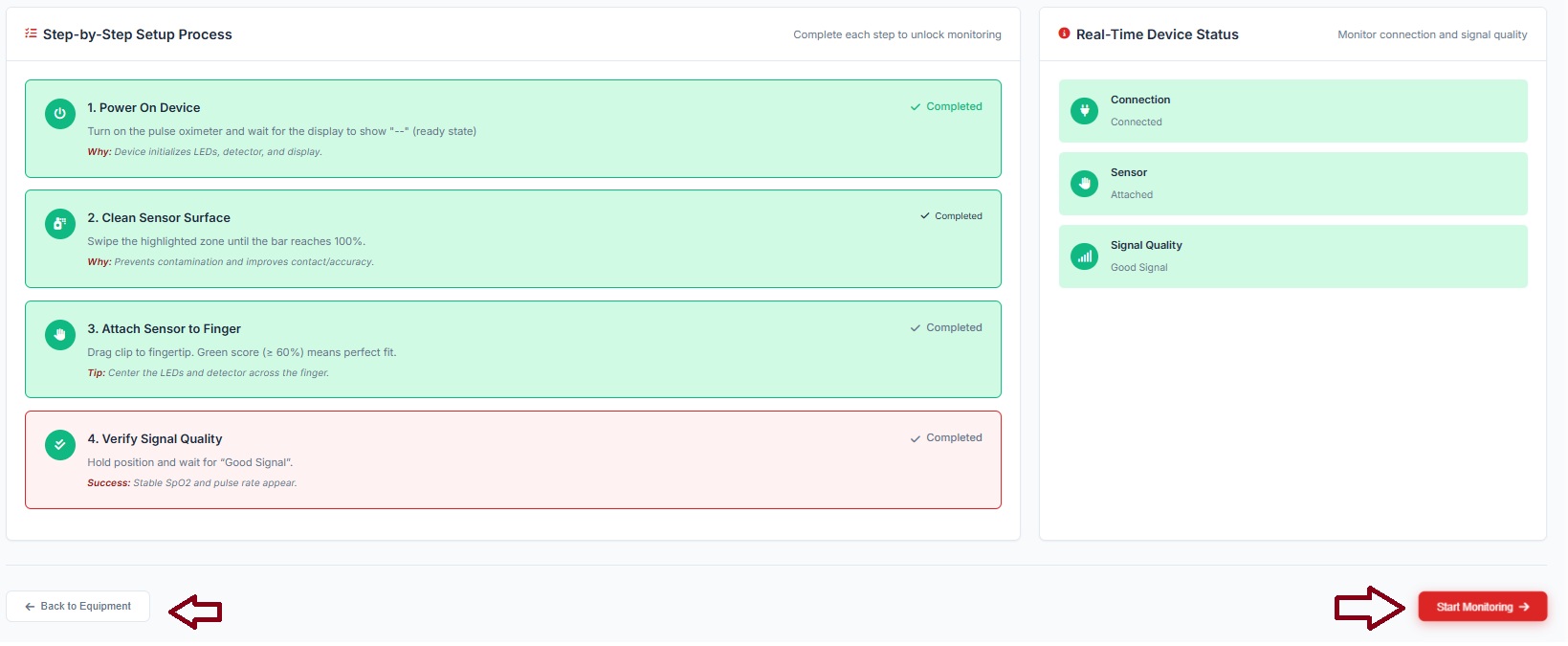 - User can observe the overview of the completed steps. User can click on Start monitoring button to move to the next step. If any clarifications were needed for the equipment setup, users can click on Back to Equipment. It will take the user to the equipment familiarization page. Then follow Step 3 to 7.