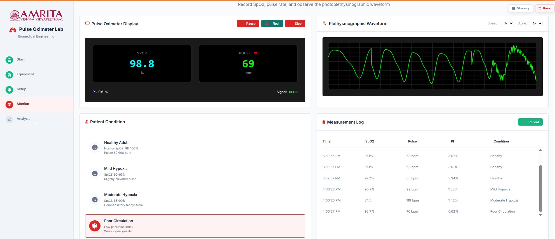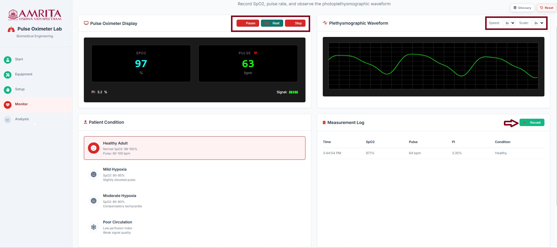 - When the user clicks on the “Start Monitoring” button, the page displays the SpO₂ value measured by the pulse oximeter along with the pulse rate, and the plethysmographic waveform. By clicking the “Record” button, parameters such as SpO₂, pulse rate, perfusion index (PI), time of recording, and subject condition are captured. Within the plethysmographic waveform display, the speed and scale can be adjusted. In the pulse oximeter interface, the user can also pause recording, enable the rest condition (allowing pulse rate and oxygen saturation to stabilize), and stop the recording as needed.