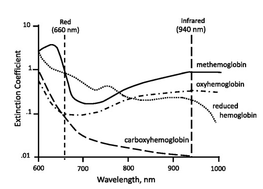 That is, light penetrates the skin and reaches a sensor that can detect the changes in absorption of the two wavelengths of light. This change in light absorption due to a cardiac cycle will generate a pulsating waveform called a PPG waveform that represents blood volume in arteries. Oxygenated haemoglobin (HbO₂) and deoxygenated haemoglobin (HbR) absorb light differently at specific wavelengths, particularly in the red (660 nm) and infrared (940 nm) regions. The absorbance ratio at these wavelengths is calculated against direct measurements of arterial oxygen saturation levels (SaO2) to correlate the pulse oximeter reading with arterial oxygen saturation levels (SpO2)(Figure 2).