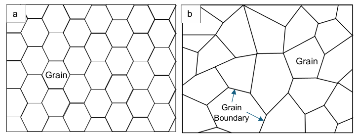 Figure 1: Schematic showing microstructure with: a) Homogeneous grains and size, and (b) Heterogenous grain size.