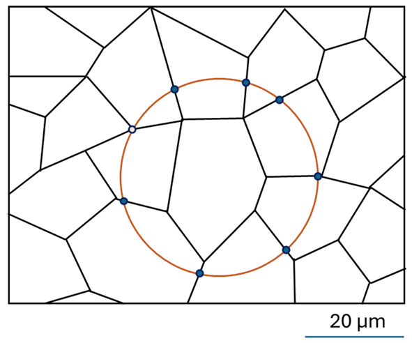 Figure 4: Grain boundary area intersections are marked with filled circles (weight of 1 each), whereas the triple point region is marked with a hollow circle (weight of 1.5)