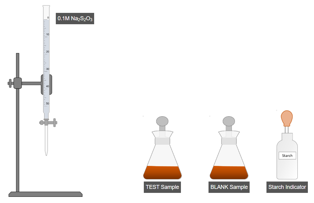 - Titrate the test sample using standard sodium thiosulfate solution.