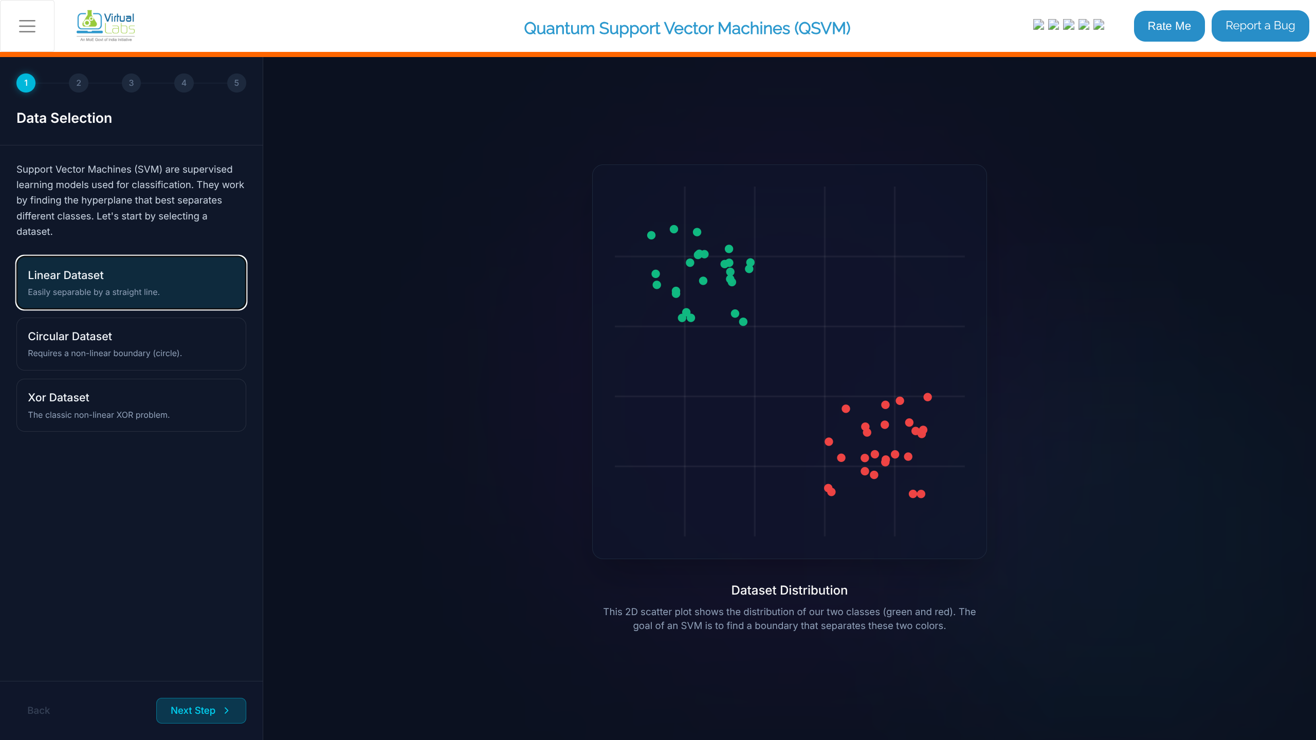 - Observe the "Dataset Distribution" scatter plot. The objective is to find a boundary separating the classes (green vs. red).