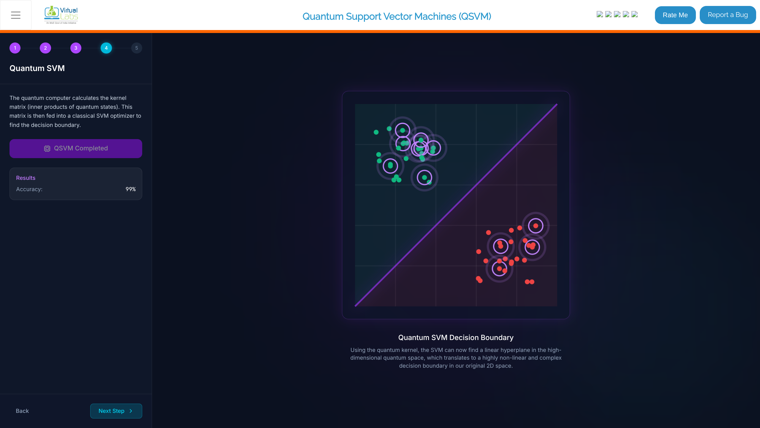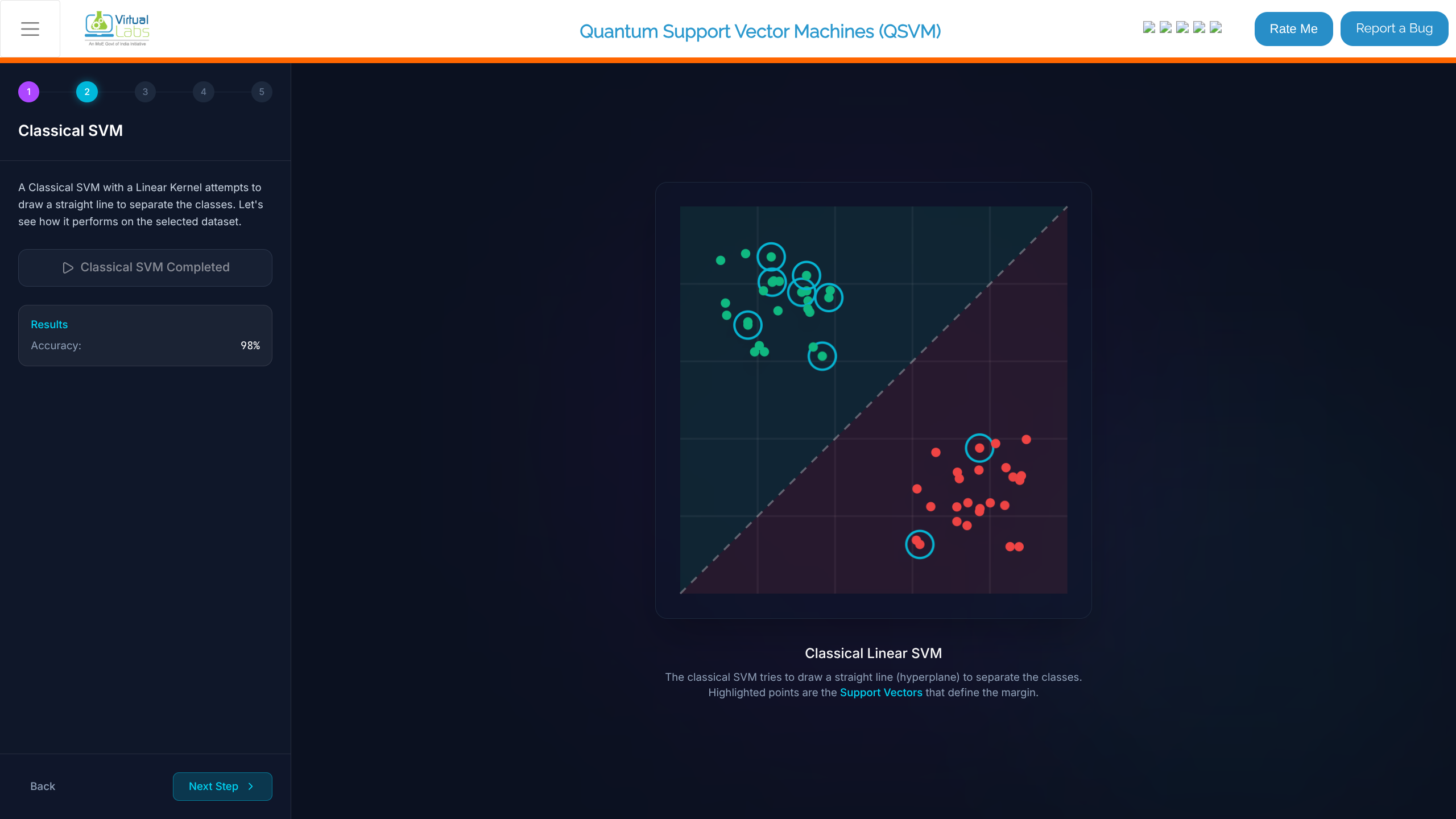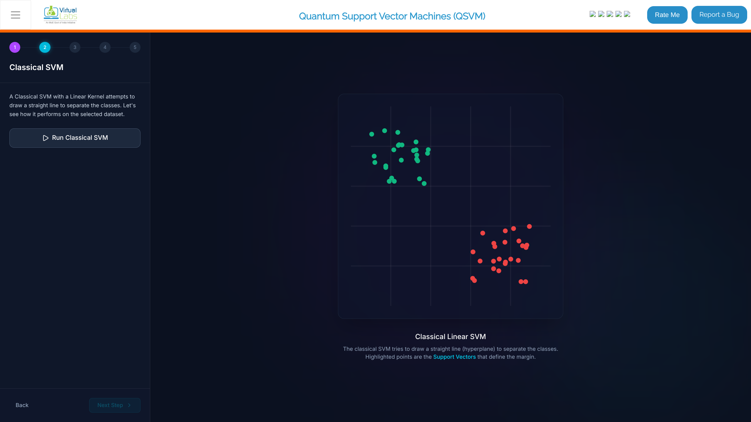- In the "Classical SVM" stage, review the prompt. This step trains a classical Support Vector Machine using a Linear Kernel.