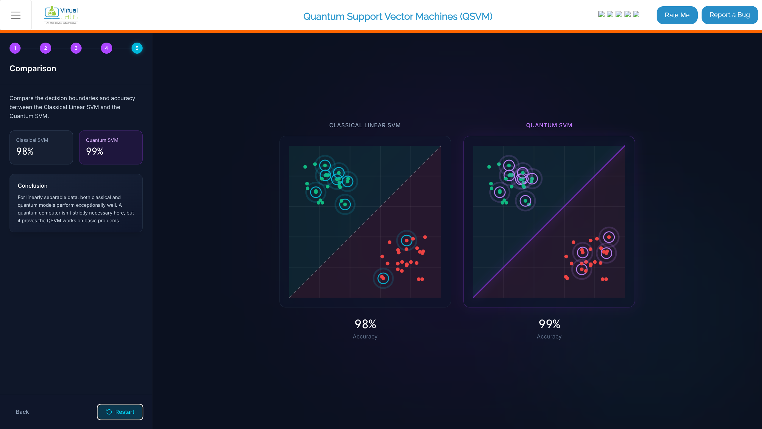 - Read the Conclusion. For linearly separable data, models perform well across the board, proving that QSVM acts properly on basic problems.