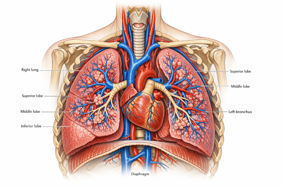 The lungs are paired, highly elastic organs located within the thoracic cavity on either side of the mediastinum, which contains the heart and major blood vessels. Structurally, the right lung is divided into three lobes—superior, middle, and inferior—whereas the left lung consists of two lobes and is slightly smaller due to the presence of the cardiac notch that accommodates the heart (Fig.1). Human respiration primarily relies on two fundamental processes: ventilation and diffusion. Ventilation refers to the mechanical movement of air into and out of the lungs, driven by the coordinated contraction and relaxation of respiratory muscles such as the diaphragm and intercostal muscles. Diffusion occurs at the alveolar level, where oxygen moves from the air-filled alveoli into the blood, while carbon dioxide diffuses from the blood into the alveoli. This process is facilitated by the extremely thin alveolar walls, an extensive pulmonary capillary network, and the large surface area of the lungs, all of which contribute to efficient gaseous exchange.