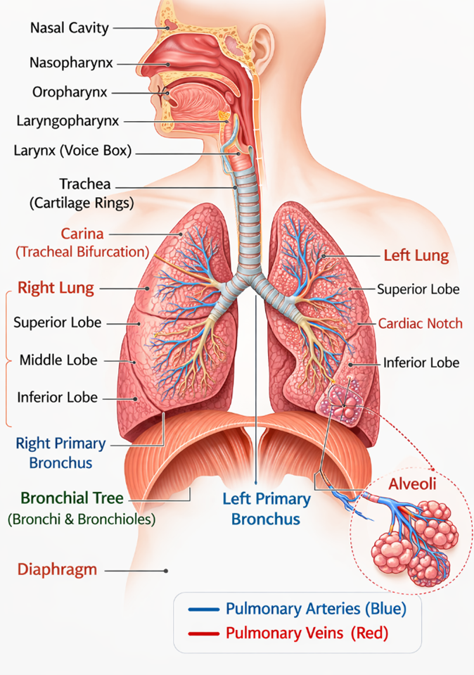 Respiration is the fundamental biological process by which living organisms exchange gases with their environment i.e. taking in oxygen (O2) and eliminating carbon dioxide (CO2) to sustain the life. Oxygen plays a crucial role in cellular respiration, a biochemical process occurring in the mitochondria where nutrients are oxidized to release energy in the form of adenosine triphosphate (ATP) which requires for the growth, repair, movement and overall metabolism. The human respiratory system functions as an integrated unit with specific tissues and organs that responsible for breathing process, the air quality and gas exchanges. It consists of airways, lungs, respiratory muscles and neural control centers which working together in a precise coordination.