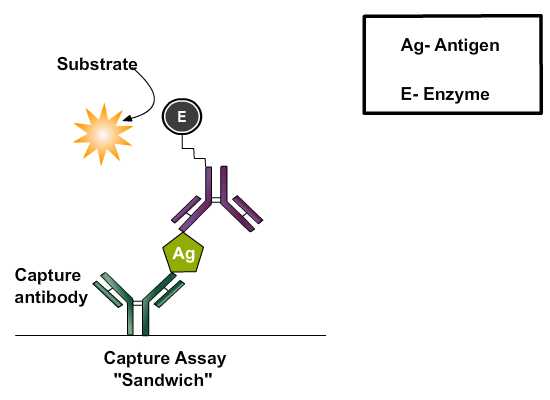 Antibody-sandwich ELISAs may be the most useful of the immunosorbent assays for detecting antigen because they are frequently between 2 and 5 times more sensitive than those in which antigen is directly bound to the solid phase. To detect antigen, the wells of microtiter plates are coated with specific (capture) antibody followed by incubation with test solutions containing antigen. Unbound antigen is washed out and an antigen-specific antibody conjugated to enzyme (i.e., developing reagent) is added, followed by another incubation. Enzyme labeled antibody can be produced in the same animal that produced passively adsorbed antibody, or from a different species immunized with the same antigen that is captured. Unbound conjugate is washed out and substrate is added. After another incubation, the degree of substrate hydrolysis is measured. The amount of substrate hydrolyzed is proportional to the amount of antigen in the test solution.