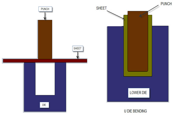 b) U Die Bending: Performed when two parallel bending axes are produced in the same operation. A backing pad forces the sheet against the punch bottom.