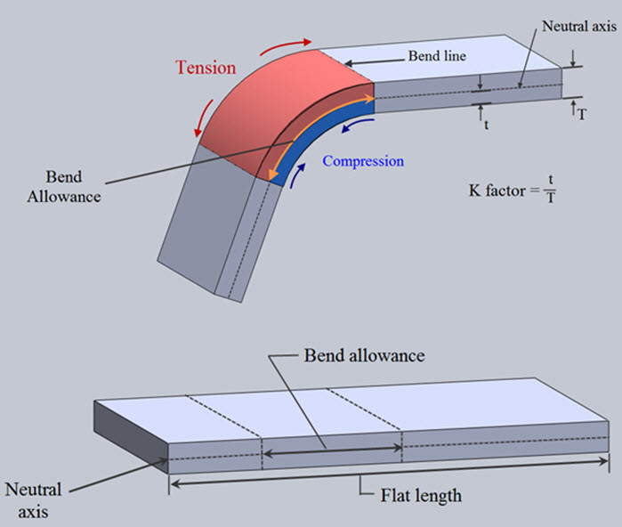 Bend Allowances: When sheet metal is bent, the inside surface of the bend is compressed and the outer surface of the bend is stretched. Somewhere within the thickness of the metal lies its Neutral Axis, which is a line in the metal that is neither compressed nor stretched.