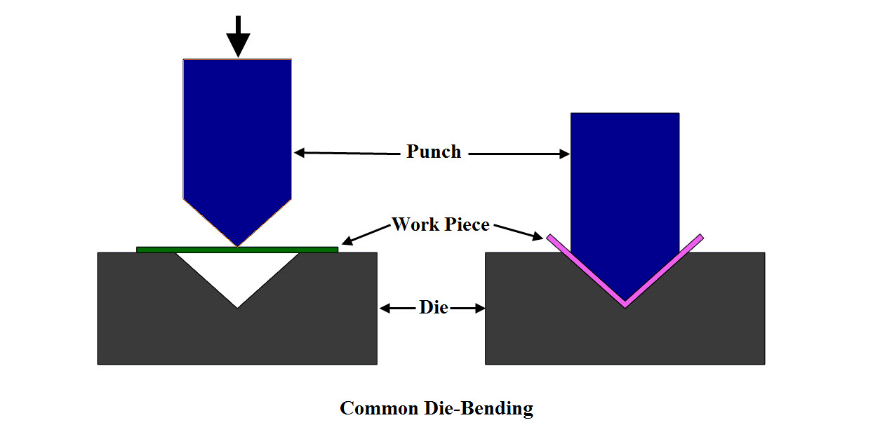 I. AIR BENDING: Air Bending is a bending process in which the punch touches the workpiece and the workpiece does not bottom in the lower cavity. As the punch is released, the workpiece springs back a little and ends up with less bend than that on the punch. In air bending, there is no need to change any equipment or dies to obtain different bending angles because the bend angles are determined by the punch stroke.