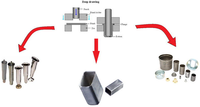 A process in which metal sheet is radially drawn into a forming die by the mechanical action of a punch. It is considered 'deep' drawing when the depth of the drawn part is more than its diameter. Industrial uses include automotive bodies, structural parts, and utensils.