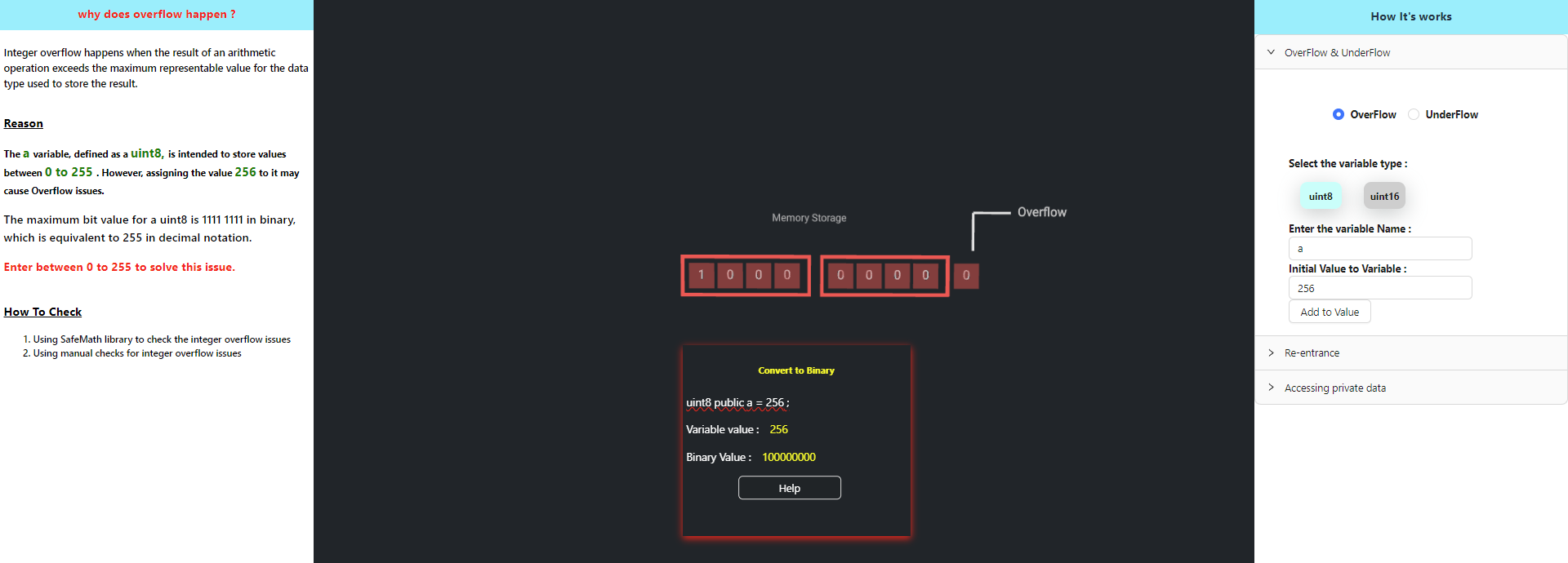 Smart contract vulnerabilities (Re-entrance, Arithmetic overflow and underflow, Accessing private data)