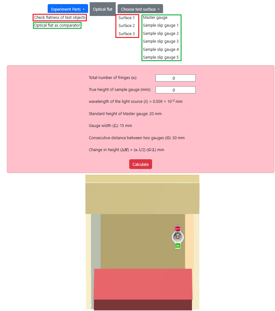 Switch on the monochromatic light source by clicking on the toggle switch and observe the fringes appeared. They are equispaced regular light and dark lines, indicating tentatively flat surface.