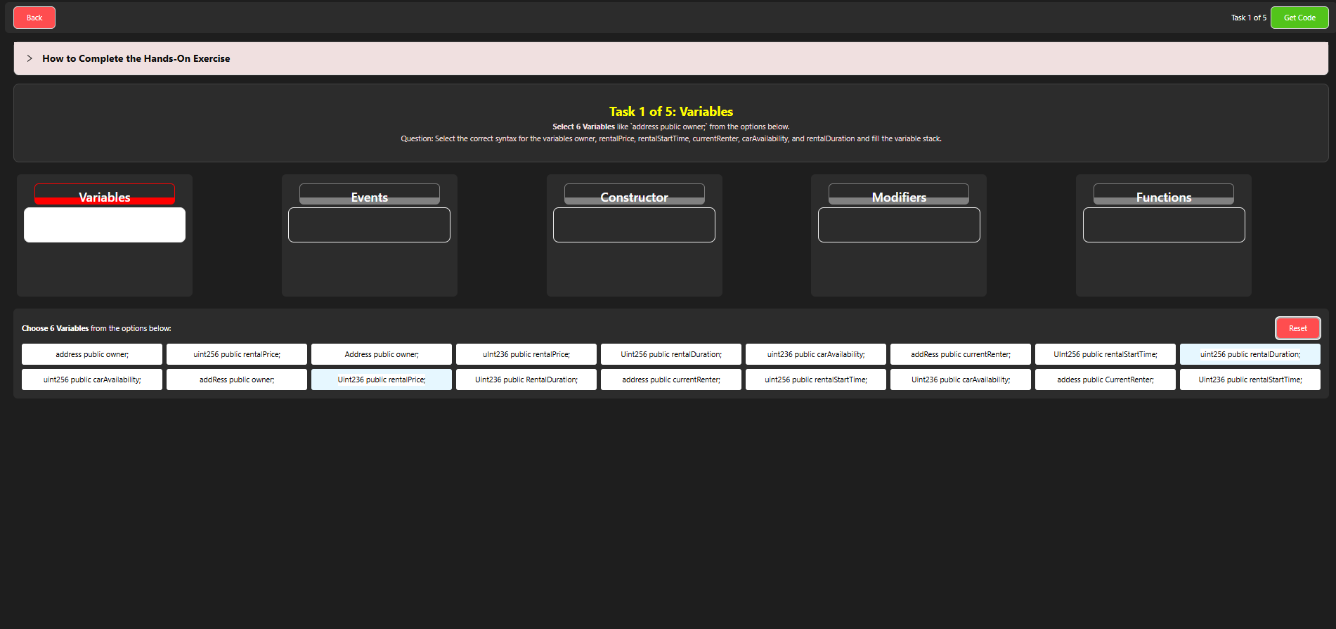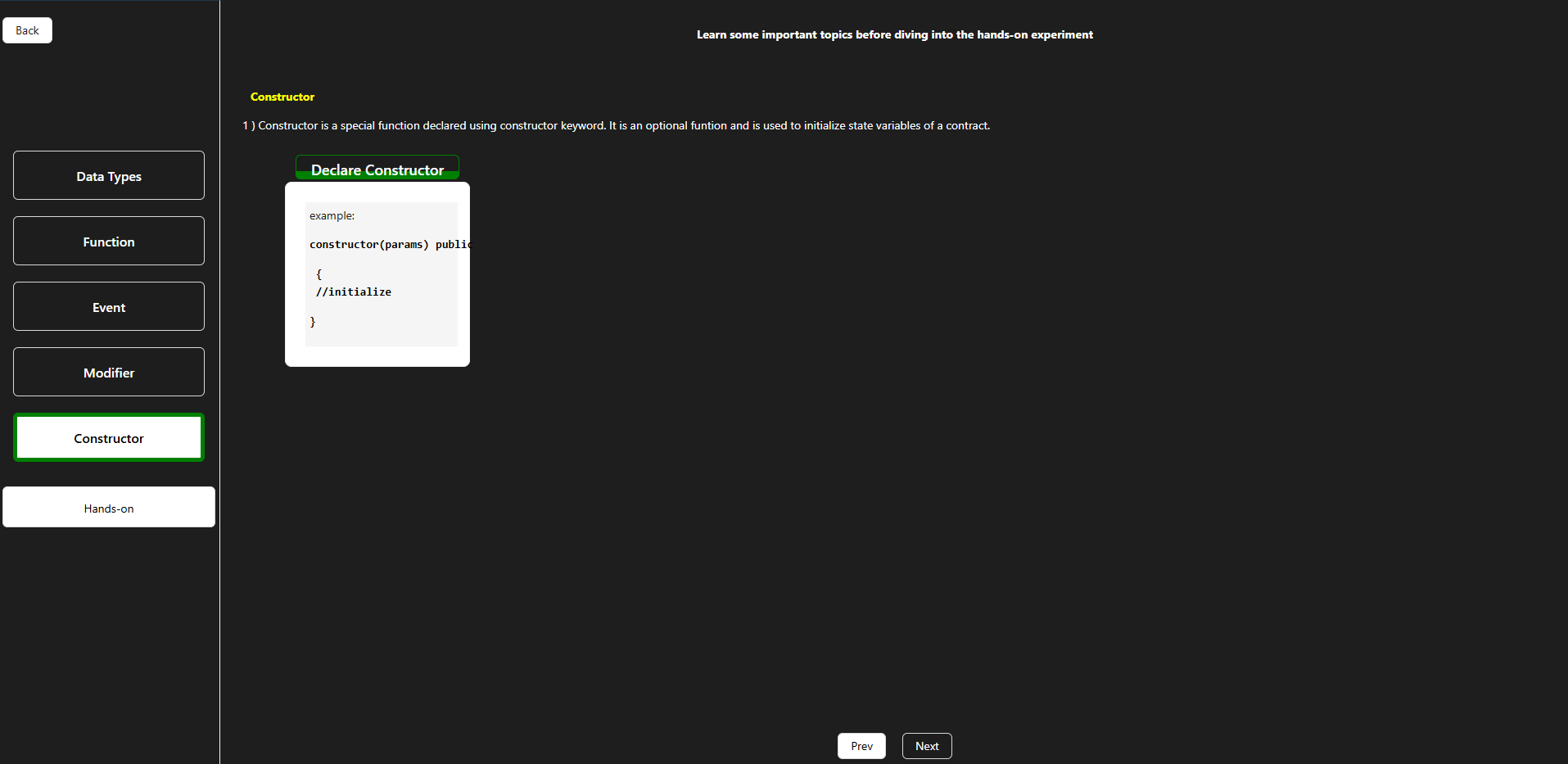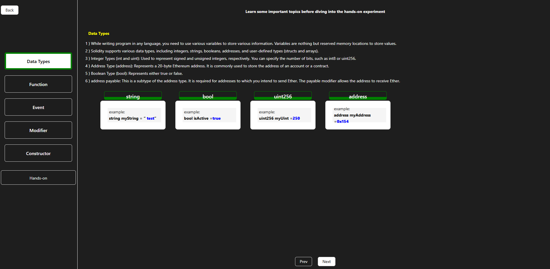Click the Next button to explore key concepts such as Datatypes, Functions, Events, Modifiers, and Constructors. After completing this section, click the Hands-On button to begin the experiment.In the Hands-On section, complete all the given tasks by selecting the correct stack and finishing the exercise.